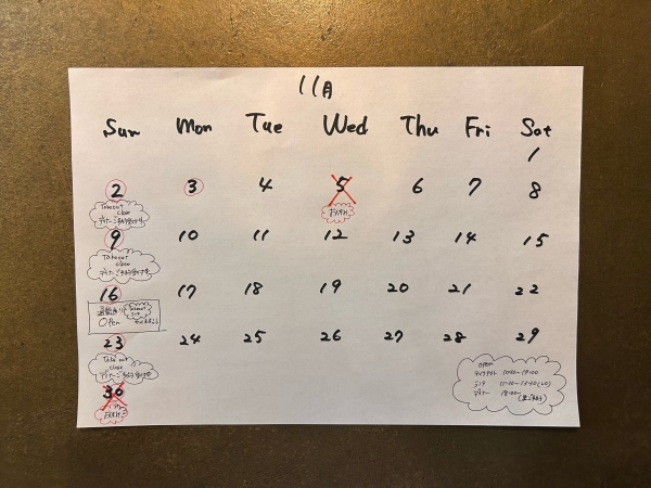 11月の営業日とクリスマスオードブル予約開始のお知らせ